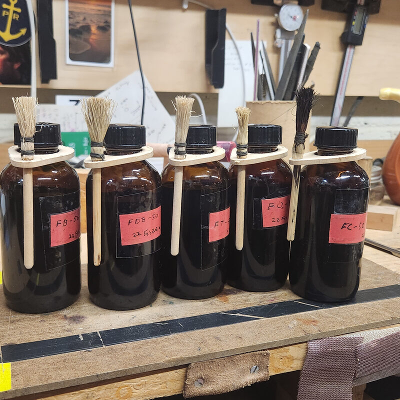 I have been mixing some custom pipe stains and re-bottling some commercial stains in Boston round bottles just to keep things neat and uniform, or at least uniform. I also came across a wonderful Japanese brush called a hakobi during a stint of fascination with Japanese wood block printmaking. You can learn more about the hakobi and how they are made in this video from David Bull’s shop, and I highly reccomend watching all of the videos from David Bull and supporting his mokuhankan print shop. He is a wise man!