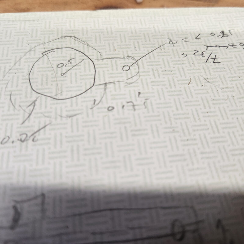 The first flash came to me about three weeks ago. I remember now thinking, “well…maybe…” But then something shiny caught my eye and I forgot all about it. But tidying the shop this past Saturday I glanced at a clipboard that held a sheet of scribbled paper and I saw the sketch below. Echos from a past I cannot recall. A note from past me to present moment me that I could not decipher. What the heck was that supposed to be. I took measurements…what was I thinking. Really, I would love to know what I was thinking.