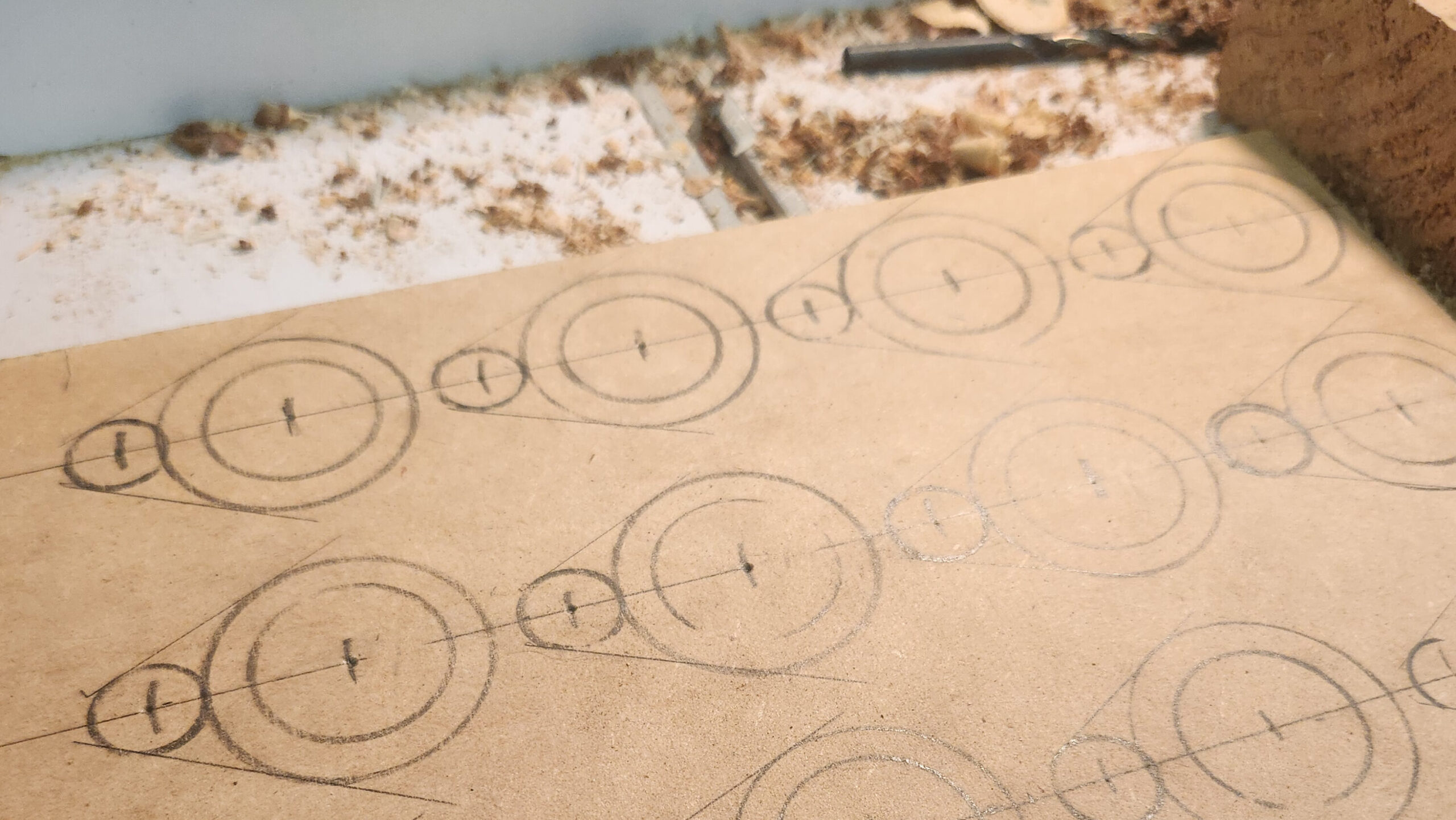 On to a production run (oh, did I mention I need a lot of these do hickeys?). First I laid out as many as I could on a piece of hardboard. Frankly the compass slipped a few times and the circles vary a bit in size. Since I was already drilling off center I figured I would just go forward and make what works rather than what is perfect (see, that prototype thing really speeds things up).